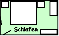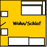 Von einem Vorflur aus betritt man die Wohnung und gelangt zunächst in eine Eingangsdiele mit Garderobe. Rechts liegt eine 1,40 m breite Schlafkoje, dann folgt das Bad mit Badewanne, sowie die Küche. Nach links gelangt man in das ca. 25 qm große getäfelte Wohnzimmer mit einer Schlafcouch für 2 Personen. Vom Wohnzimmer aus betritt man das helle, getäfelte Schlafzimmer (ca. 15 qm) mit zwei Betten (je 1x2 m). Die Wohnung verfügt über einen Flachbildfernseher und kostenloses WLAN.